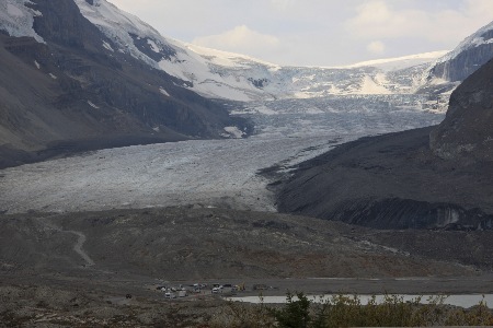 Kanada. am Icefield Parkway, unten ein Parkplatz vorm Gletscher